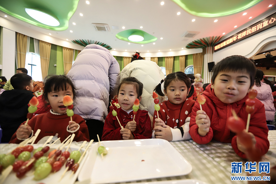 垂涎欲滴的冰糖葫芦、好吃好看的花式棉花糖、栩栩如生的糖画……近日,江西省余干县实验幼儿园开展“民俗润童心 欢乐迎新年”迎新活动,学生们通过手工制作福字、剪纸、糖画、灯笼等民俗文化传统项目,体验非遗文化的魅力,迎接农历新年的到来。(韩海建)
