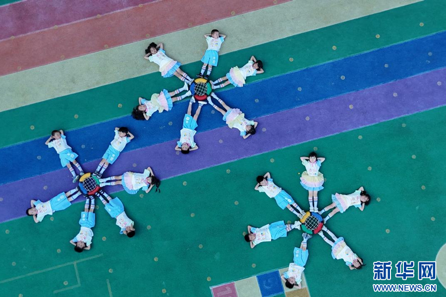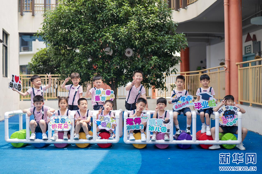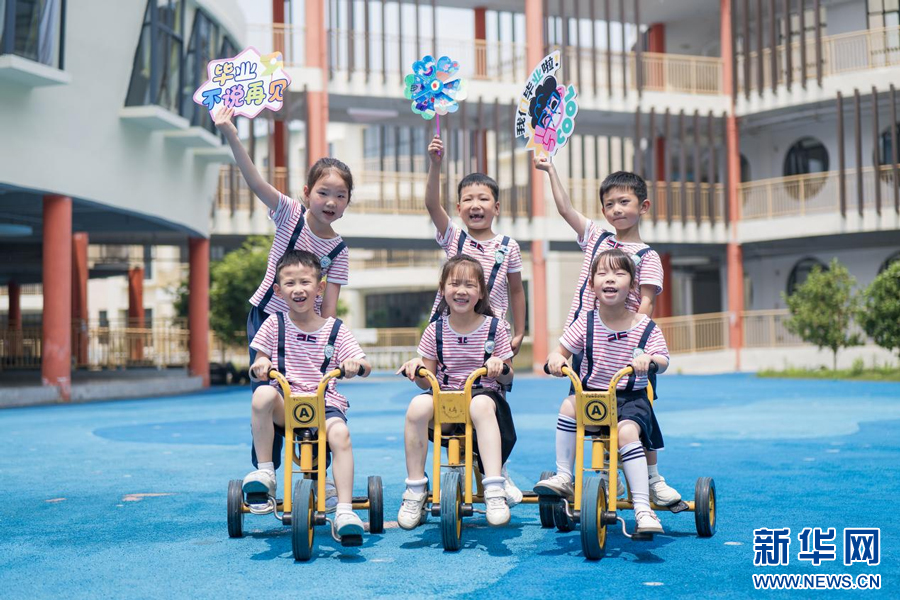 江西省余干县第七幼儿园大班的小朋友在操场上拍摄创意造型毕业照。 新华网发 韩海建 摄