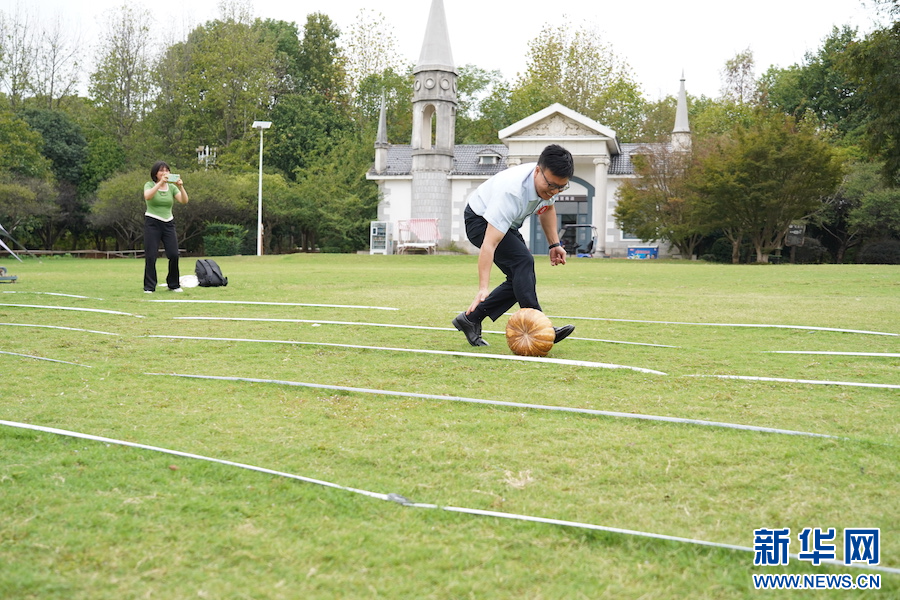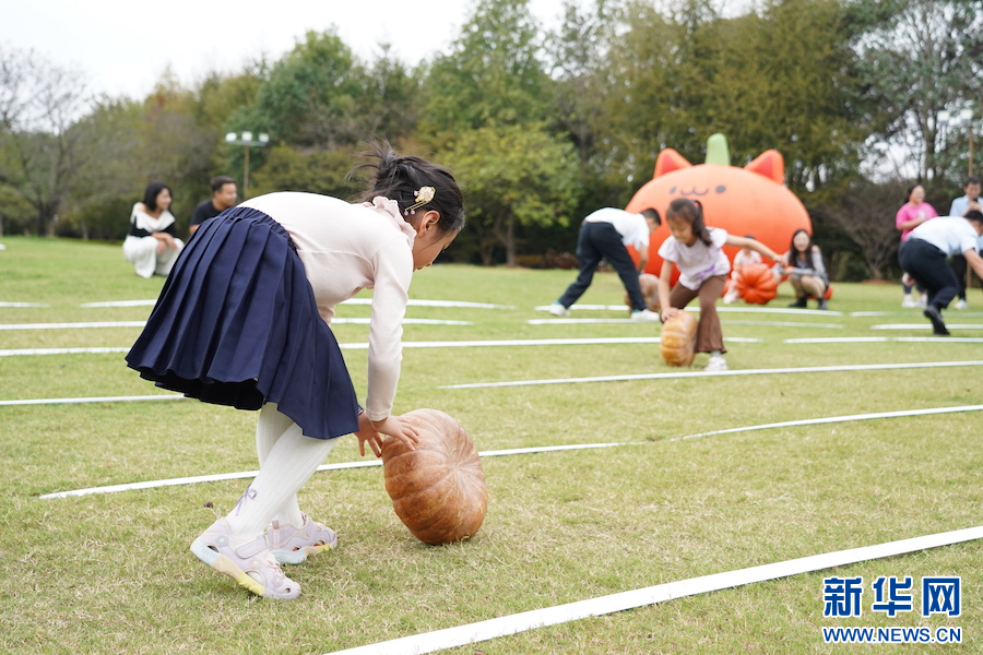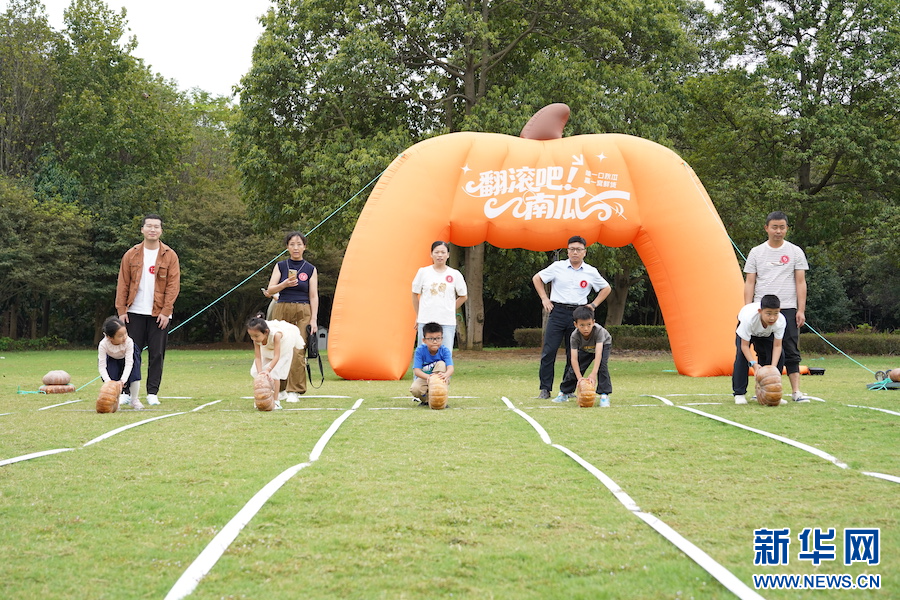 10月18日,江西南昌凤凰沟景区内秋意盎然。一场充满趣味与活力的滚南瓜亲子接力赛在这里举行。参赛选手们推滚着南瓜,你追我赶,好不热闹。跑道上,滚动的南瓜与奔跑的身影相映成趣,构成了一幅生动的秋日亲子欢乐画卷。