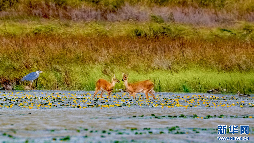 在江西永修县吴城鄱阳湖候鸟保护区朱市湖,摄影爱好者捕捉到“麂鸟共舞”的灵动瞬间。新华网发