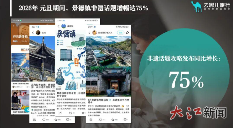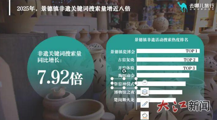 去哪儿旅行2025年景德镇非遗旅游市场数据显示,景德镇以手工制瓷技艺为核心的非遗旅游热度持续攀升。2025年,景德镇跻身全国非遗旅游TOP10热门目的地第3位,同时稳居江西省非遗旅游TOP5热门目的地首位;全年非遗关键词搜索量增长近八倍,相关关键词搜索量同比增幅达7.92倍。其中,景德镇瓷博会、古窑复烧、开窑体验位列非遗活动搜索热度前三。值得关注的是,2026年元旦期间,景德镇非遗相关话题热度增幅高达75%,非遗旅游市场持续升温。