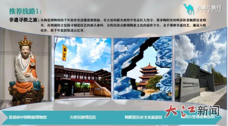 线路2:瓷韵匠心之旅。探访邓希平颜色釉展示馆、镇尚陶瓷、诚德轩等国家级非遗代表性传承人展示馆及国家级非遗生产性保护示范基地,与当代制瓷大师面对面交流,近距离观摩颜色釉、青花等非遗技艺的活态传承,感受“守艺千年”的匠人精神。此外,还可欣赏实景演出《china》,在光影与歌舞交织中穿越瓷都千年岁月,读懂陶瓷文化传承脉络。