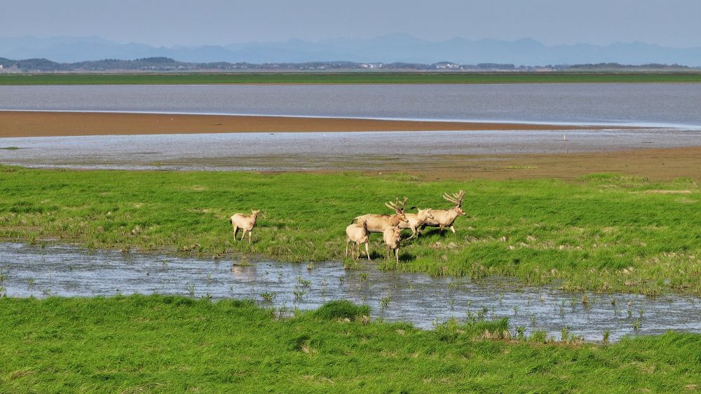 这里也是江豚、候鸟、麋鹿等“大湖精灵”钟爱的栖身之所:长江生态系统的旗舰物种长江江豚游弋湖中,种群数量稳步增长;每年超70万只候鸟飞临,越冬白鹤数量居全球之最;一度绝迹的麋鹿重归,数量较野放时翻番……