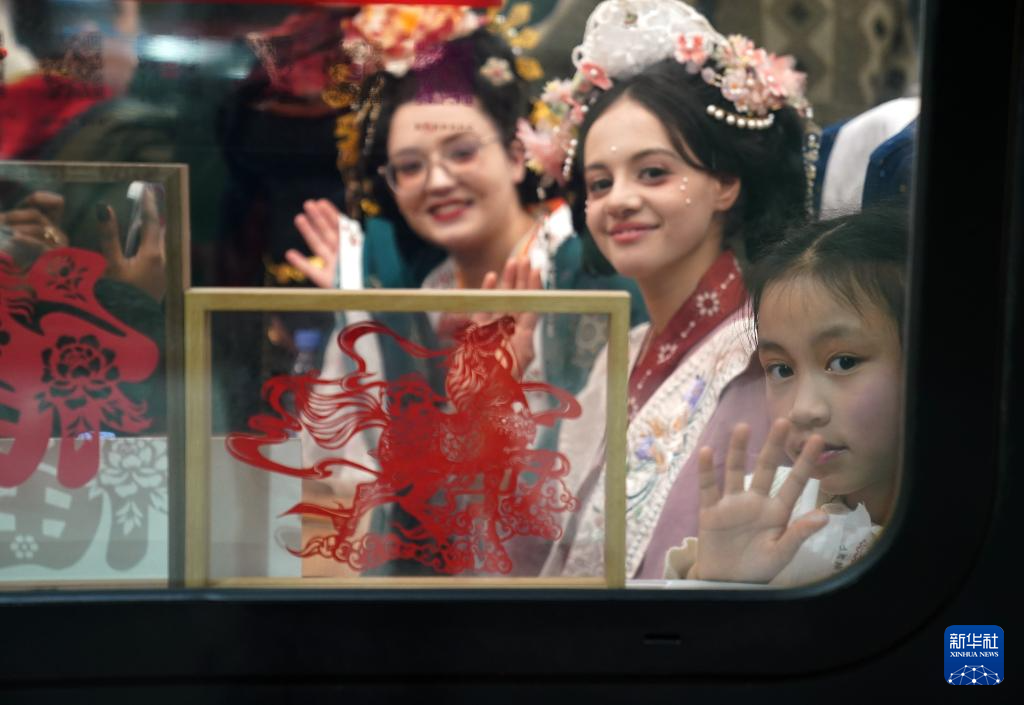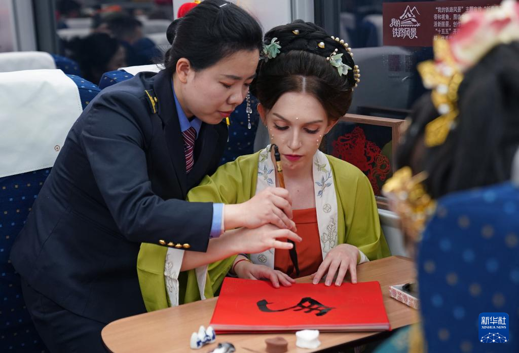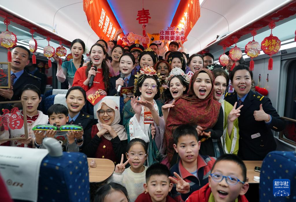 春节来临之际,一场特殊的“春晚”在南昌至北京丰台的D138次列车上举行。列车工作人员与外国留学生通过汉服展示、歌舞表演、书法互动等活动,让旅客在这个流动的大家庭里,感受各国文化的魅力与暖意融融的中国年味。新华社记者 万象 摄pagebreak