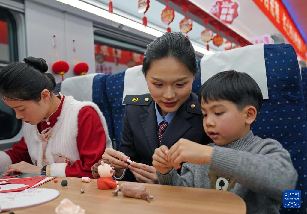 2月10日,列车工作人员陪小旅客捏橡皮泥。新华社记者 万象 摄pagebreak