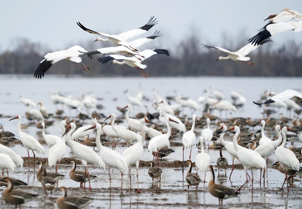 2月27日在江西上饶市余干县白鹤洲拍摄的白鹤等候鸟。新华社记者 万象 摄