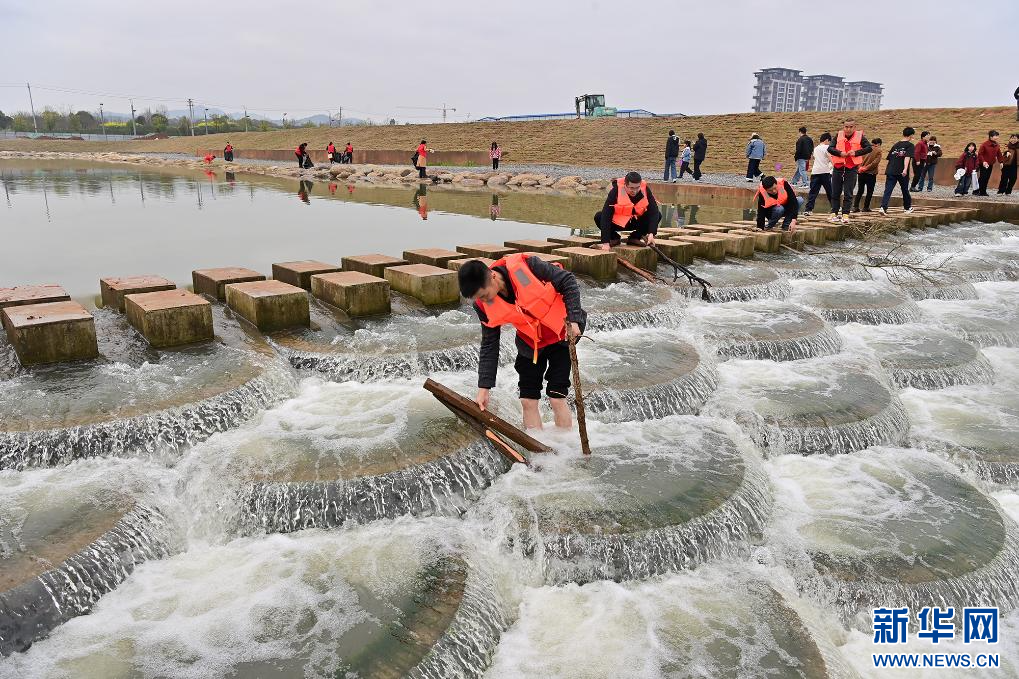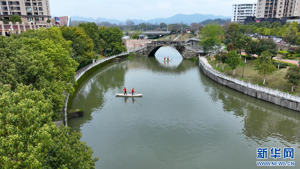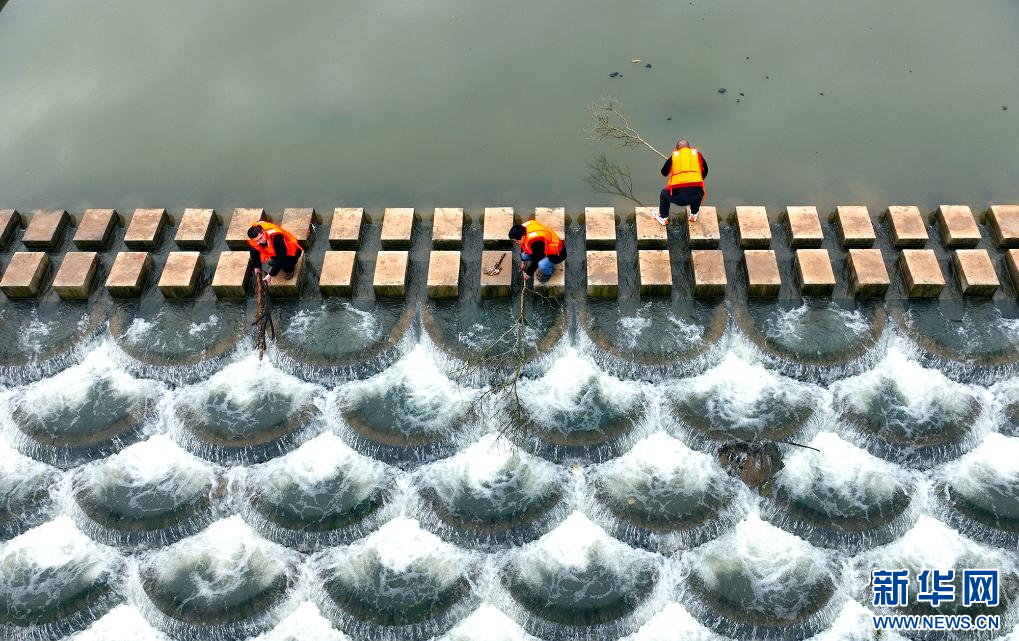 3月21日,在江西省宜春市万载县康乐街道龙河段,志愿者正在巡河护水,清理河面漂浮垃圾。新华网发 邓龙华 摄