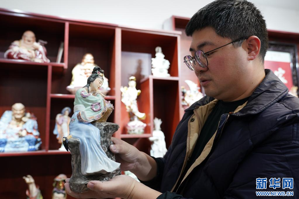 曾锐在展示家族前辈创作的雕塑瓷作品(3月12日摄)。