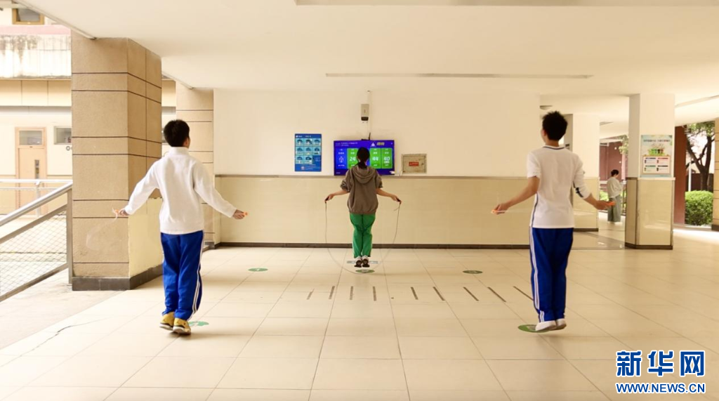 同学们正在运用“AI智慧运动打卡”进行跳绳运动。新华网发