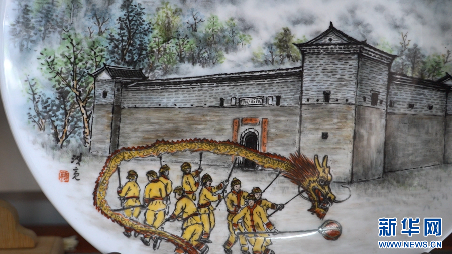 图为蒋洪亮创作的以客家围屋为主题的客家瓷画。新华网 王凯丰 摄