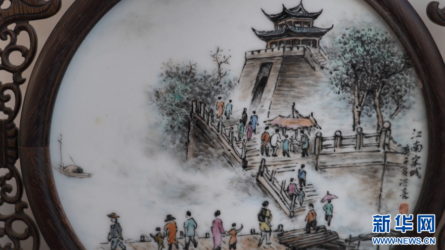 图为蒋洪亮创作的以赣州古城墙为主题的客家瓷画。新华网 王凯丰 摄