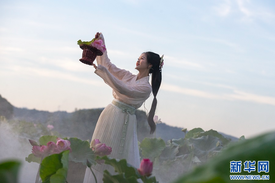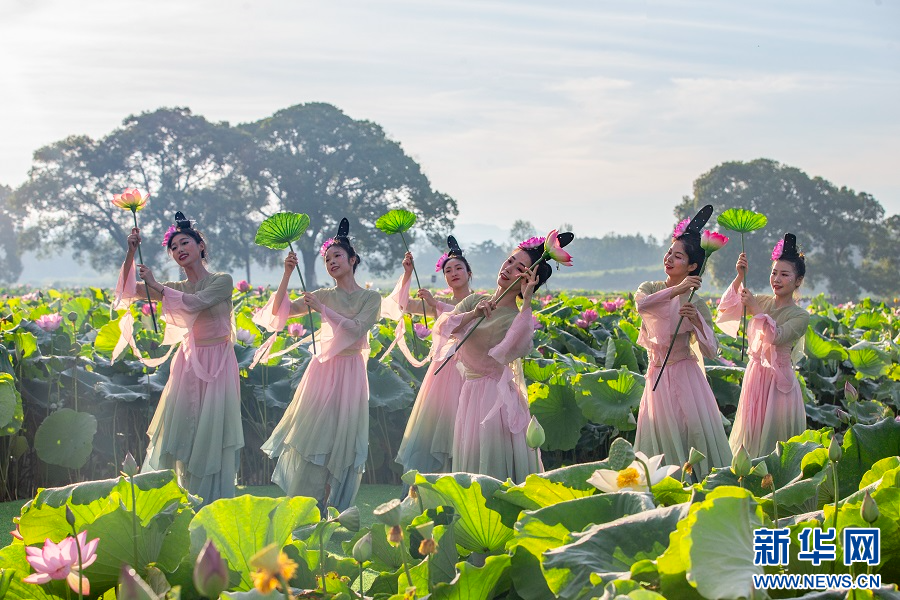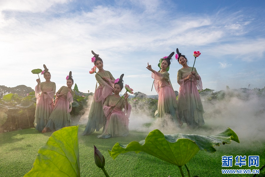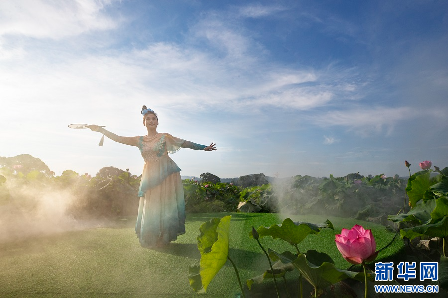 红莲与置身其中的舞者,共同绘就了一幅雅致的夏日画卷。新华网发 谢昌建 摄