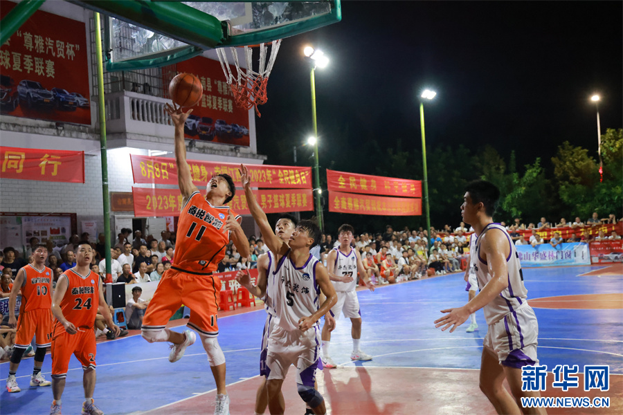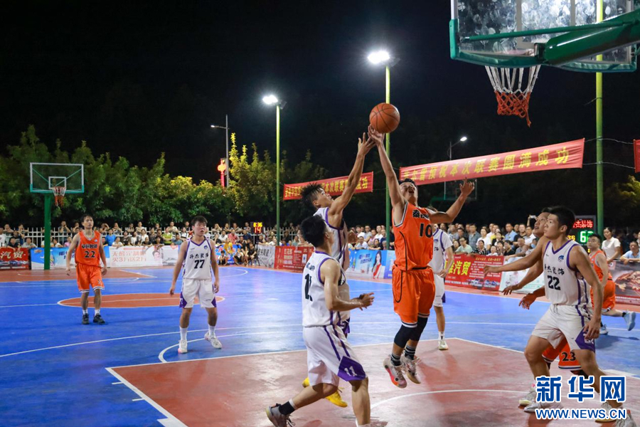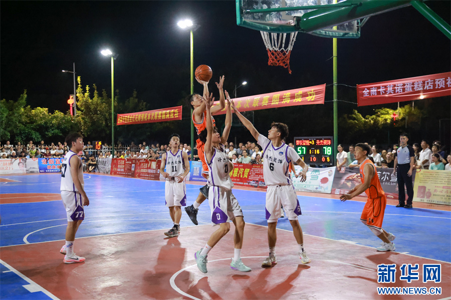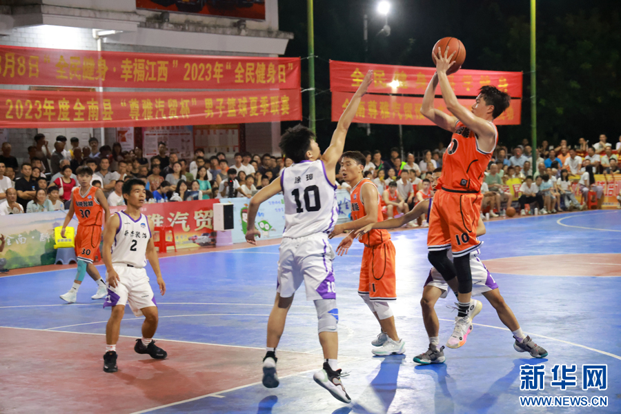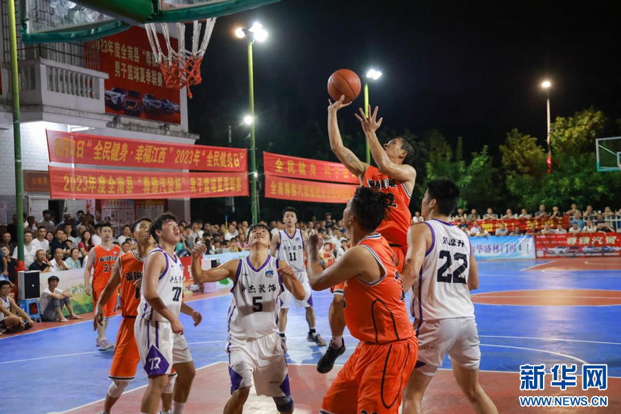 江西省赣州市全南县体育中心,篮球运动员正在比赛中。新华网发 李凡钦 摄