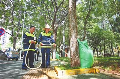 ▶8月3日,南昌市红谷滩区丽景路,园林工人正在对行道树挂袋注水,采取水袋滴灌方式护绿。为确保绿化苗木安全度夏,该区在利用喷灌设施、洒水车、人工精细化浇灌等方式抗旱基础上,对辖区主次干道等重点路段10万多棵树木进行滴灌保湿,最大限度减少夏季高温造成的苗木损失。王蕴蓉摄