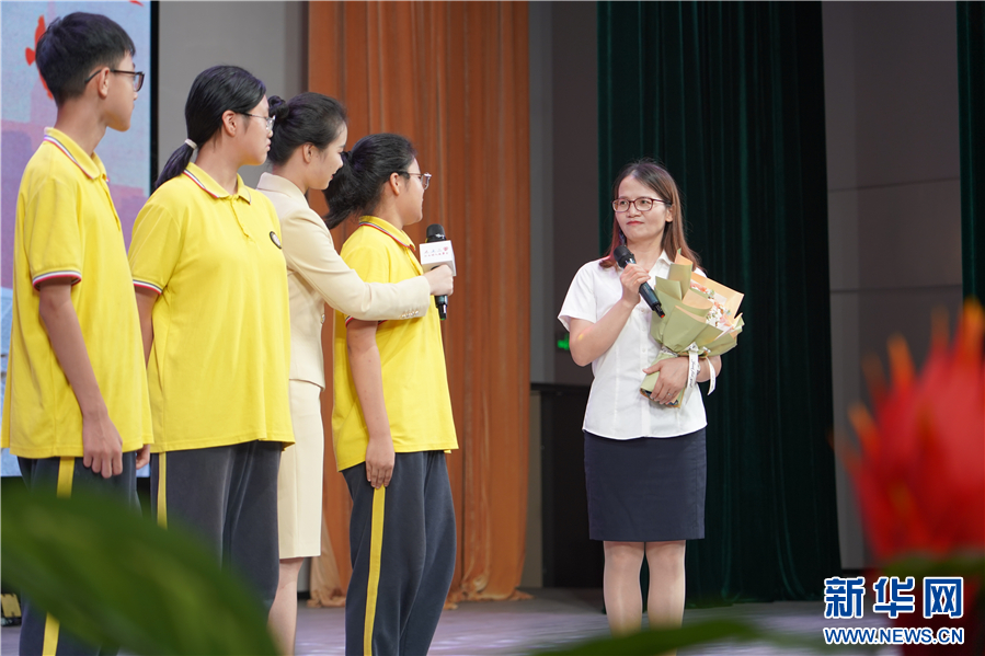 海棠中学老师陈淑萍(右一)与同学们台上交流。新华网 王晓震 摄