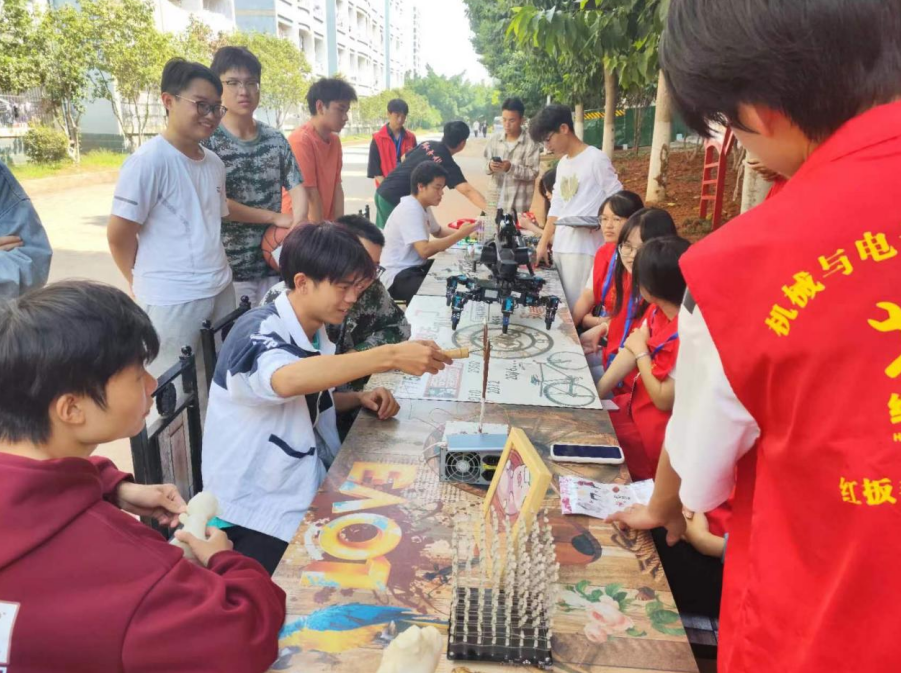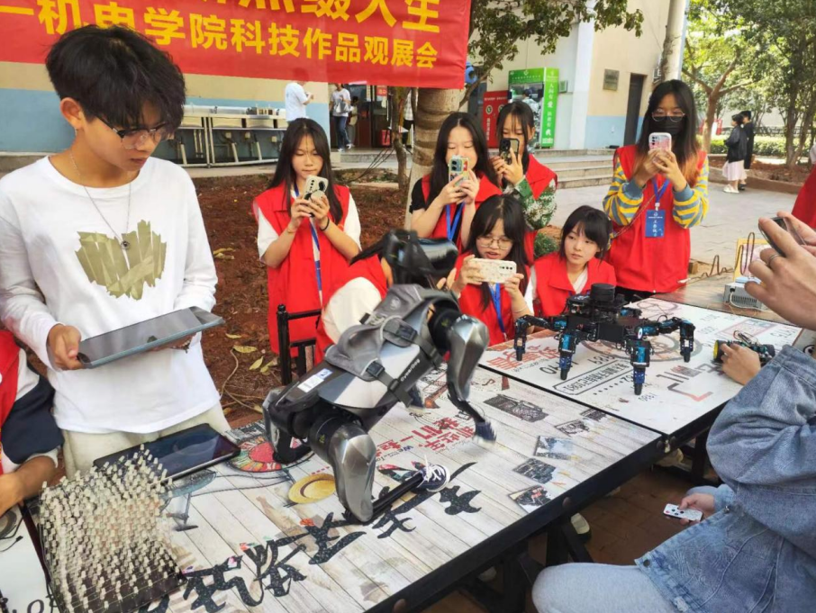 本次观展会作品内容丰富、覆盖面广。其中,机器狗和机器蜘蛛受到广大师生的喜爱,展示过程中,各项目团队围绕作品工作原理、技术路线以及创新性、应用前景等方面向观展师生进行了详细的介绍。现场还展示了许多学生研究成果,如遥控小车、走马灯、LED彩灯模型、3D打印模型、自行设置的游戏设施等,进一步提高了同学们对科学知识的认识,强化了同学们对专业知识的了解,促进了同学们创新创业能力的全面提升。