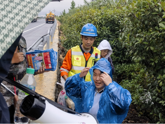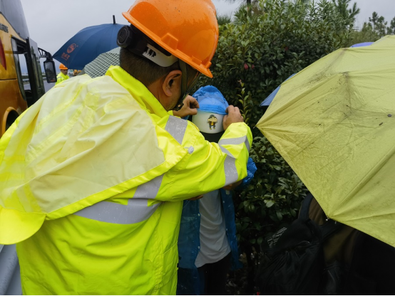 “看这个雨应该会越下越大,我们不能让学生们淋湿了.......”现场救援人员急忙拿出雨衣,分发给未携带雨具的学生们。“叔叔叔叔,这个雨衣怎么穿的呀?”面对孩子们的疑问,救援人员耐心做着示范,并帮助学生们将雨衣穿好。