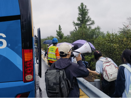 当天中午12时20分左右,转运的大巴车到达现场。救援人员组织学生们在护栏外排队依次上车,并做好现场秩序维护。5分钟后,学生们陆续上车,细心的救援人员登上大巴车协助清点了人员,确保没有遗漏。
