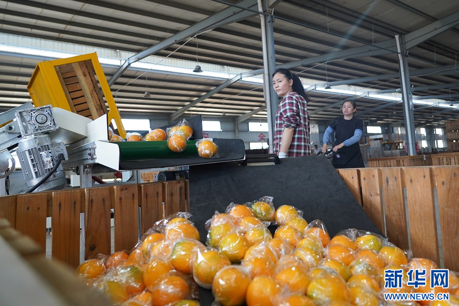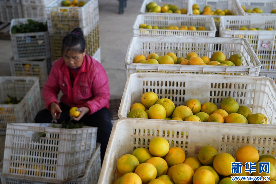 在赣州市安远县鹤子镇龙岗村的脐橙加工车间,果农在分拣脐橙。新华网 王凯丰 摄