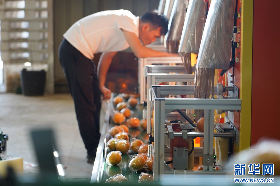 在赣州市安远县鹤子镇龙岗村的脐橙加工车间,果农在检查自动包装设备。新华网 王凯丰 摄