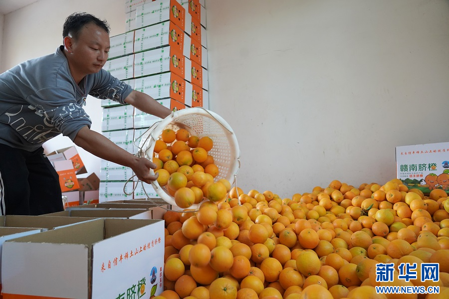 在赣州市信丰县西牛镇的一处果园内,果农在分拣脐橙。新华网 王凯丰 摄