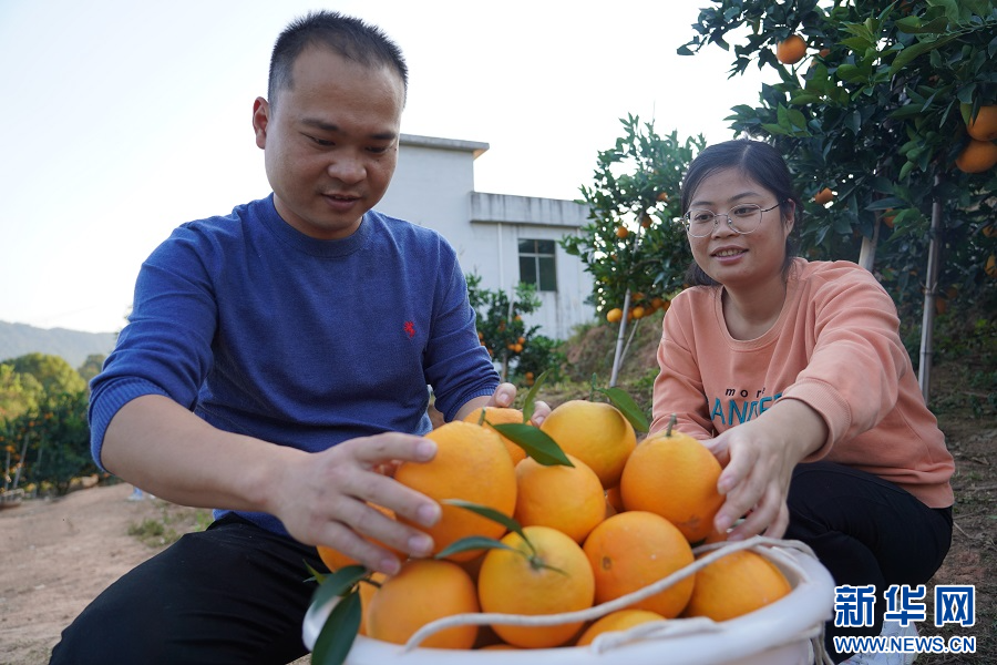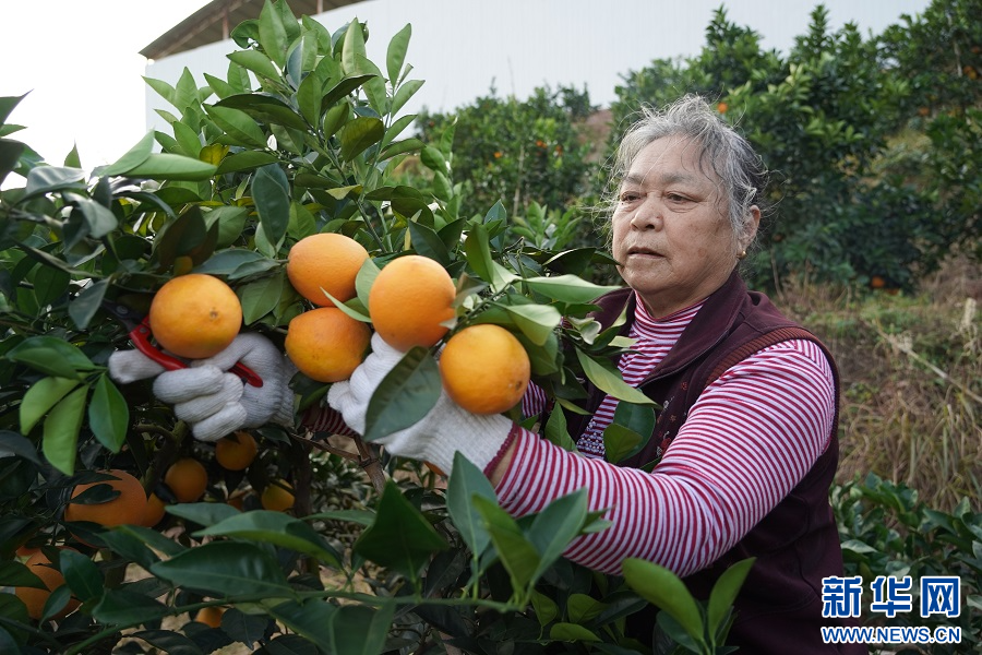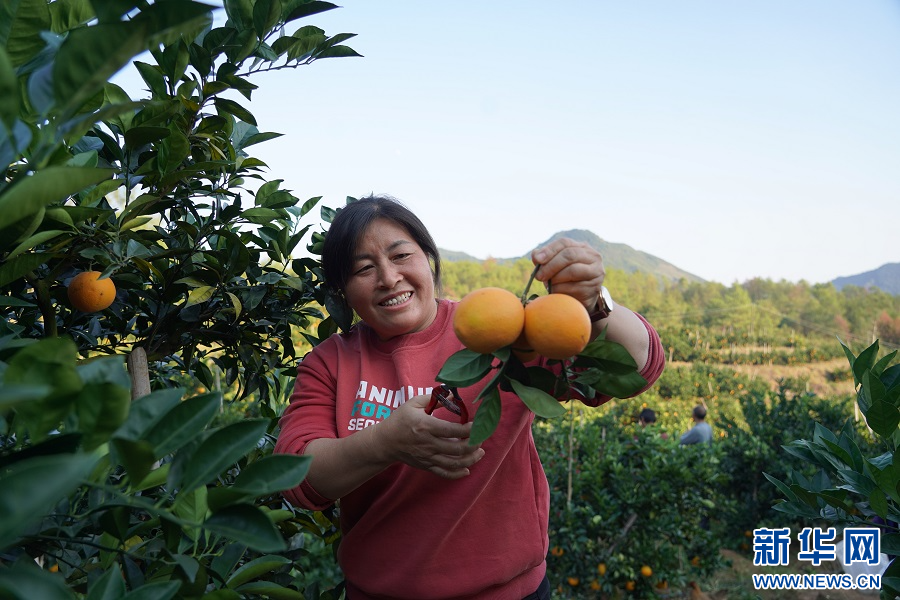 在赣州市信丰县西牛镇的一处果园内,果农在采摘脐橙。新华网 王凯丰 摄