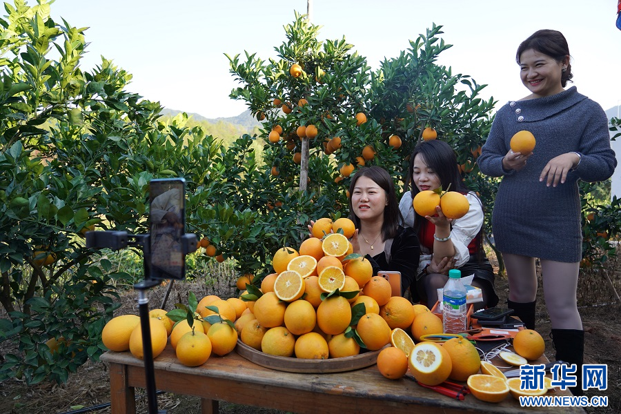 在赣州市信丰县西牛镇的一处果园内,当地村民在直播卖货。新华网 王凯丰 摄