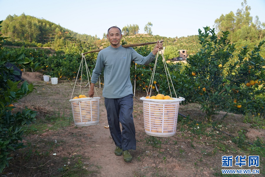 在赣州市信丰县西牛镇的一处果园内,果农在挑运脐橙。新华网 王凯丰 摄