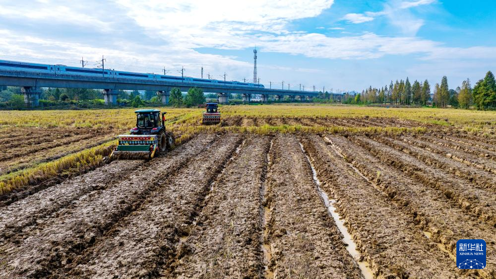 图为在吉安市吉水县八都镇毛家村,农机手驾驶耕种肥一体机播种油菜。(廖敏 摄)