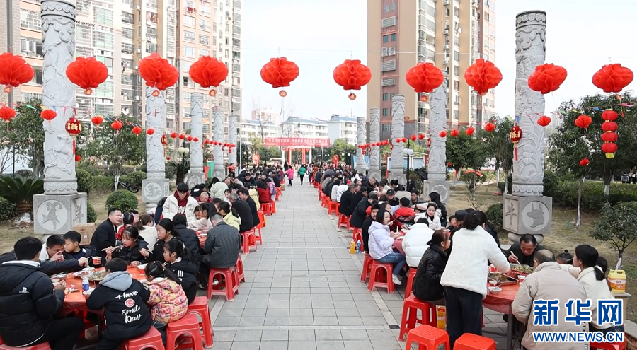 集百家盛宴,话邻里之情。春节临近,一场别开生面的“邻里相聚百家宴 浓墨飘香迎新春”活动在江西省九江市修水县举行,400余名社区居民欢聚一堂,拉家常、写春联、吃团年饭……共同迎接新春佳节的到来。(王凯丰 实习生 朱圣嘉)