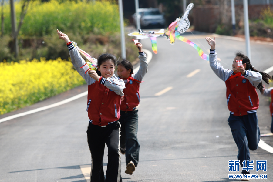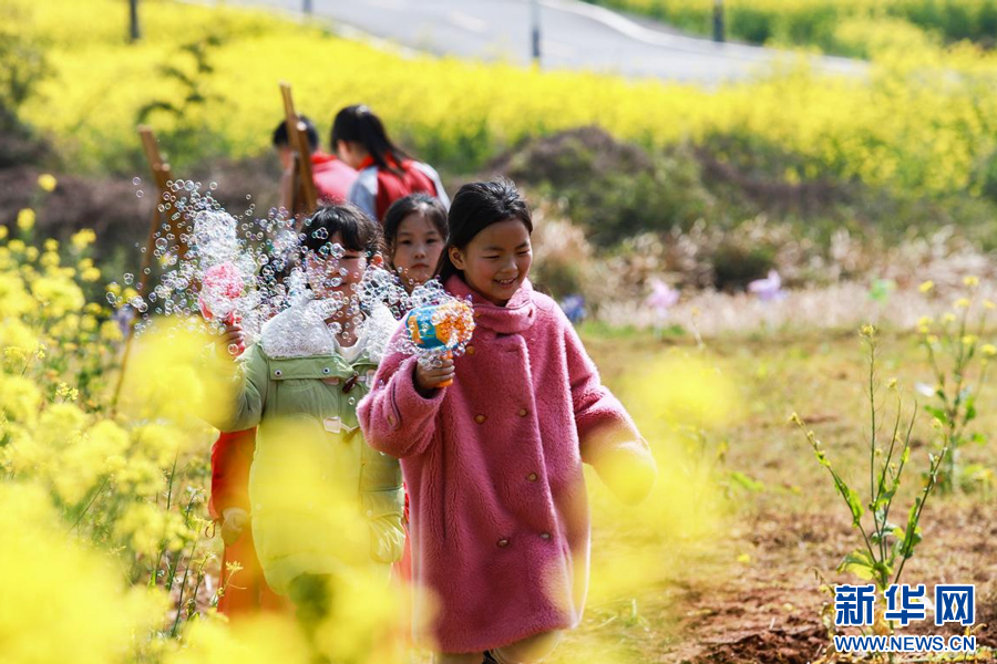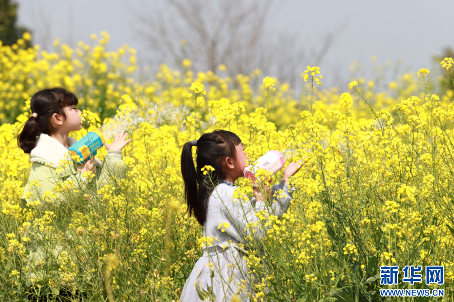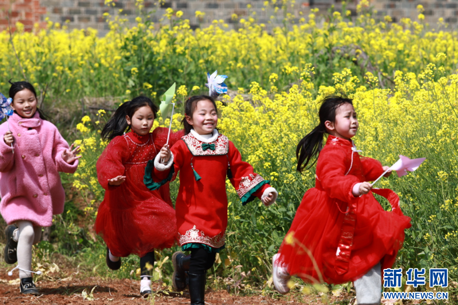 孩子们在油菜花海间玩耍。新华网发 韩海建 摄