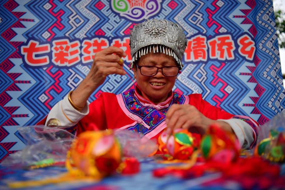 4月13日,江西省宜春市上高县敖山镇洋林归侨少数民族聚居村的村民在制作特色香囊。(时雨 摄)