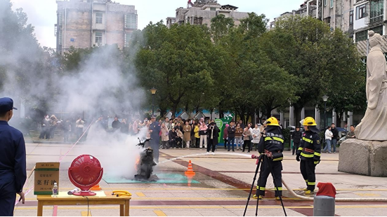 火焰“腾”的一下升起,伴随浓烟滚滚和居民的阵阵惊呼,在金溪县象山广场,城市社区、县消防大队联合消防演练活动正式开始。