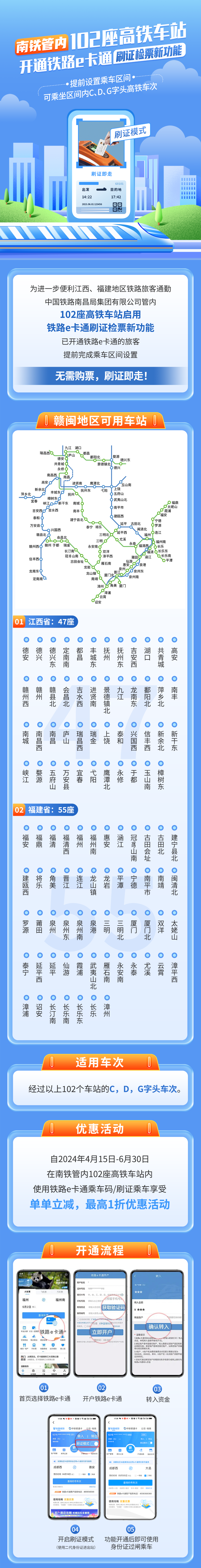 好消息!为方便通勤、商务等旅客出行,自4月18日起,中国铁路南昌局集团有限公司在赣闽两省102座火车站,启用铁路e卡通刷证检票新功能,使用铁路e卡通乘车每单随机立减优惠,最高可享受票价1折。