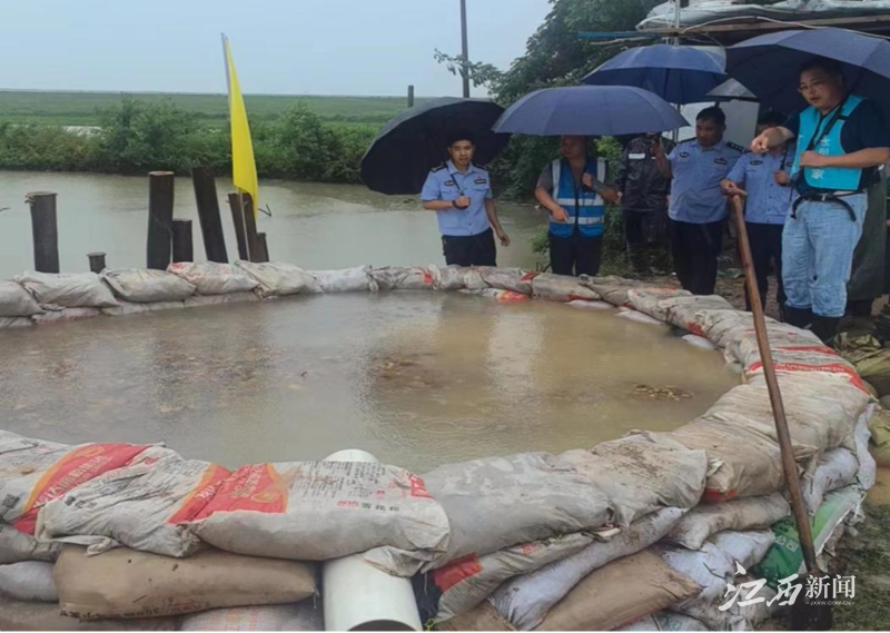 在上饶鄱阳,专家组廖冬芽、张志林、张秀峰一行首先处理的是中洲圩小渡牌楼提灌站险情,该处险情为穿堤涵管管壁渗水,水量稍大且带泥沙。由于涵管管径小,人员无法进入,在经过现场分析论证后,商议采取出口围井抬水平压方式处理,降低内外水位差,减缓渗漏。
