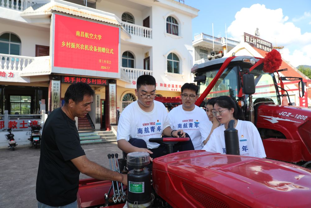 南昌航空大学乡村振兴农机设备捐赠仪式现场,实践队队员们向农机人员请教农机操作。李言金摄