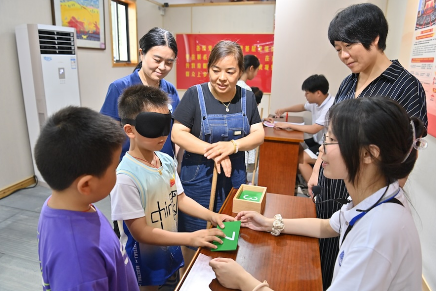 为了更好地进行眼健康知识科普,实践队还开展了一场角色扮演活动——“盲人体验”,包括“盲人摸象”“摸点识数”“蒙眼写字”“盲道模拟”四个环节,让农村儿童们在游戏环节体验中,深刻意识到保护眼睛的重要性。