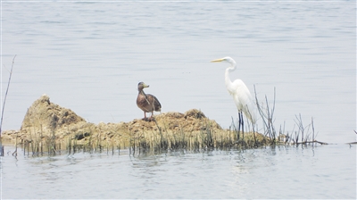 水鸭与鹭鸟在湖面休憩