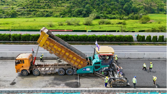 在沥青摊铺现场,各类施工设备轰鸣作响。高温是确保沥青与砂粒充分混合、与路基牢固结合的重要条件。“混合料刚出站有180℃左右,刚摊铺出来也有150℃。”现场负责人介绍道。此时周边路面温度接近50℃,一辆沥青投料车正将冒着热气的沥青料输送到摊铺车上,现场施工人员头顶烈日,身着长衣长裤,穿着特制的防高温胶鞋,测量、检测、摊铺......配合默契,他们抢抓当前沥青摊铺施工的关键时机,鏖战在施工一线,严格把控着摊铺厚度和压实度,以求达到最佳铺设效果,确保施工质量,为后续大面积导改任务开展创造有利条件。