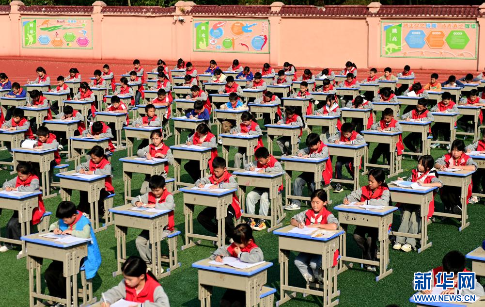 江西省宜春市万载县茭湖乡中心小学学生在参加汉字书写大赛硬笔项目的比赛。新华网发 邓龙华 摄