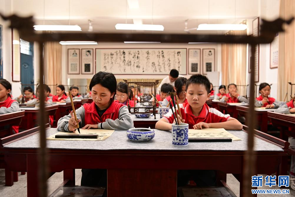 江西省宜春市万载县茭湖乡中心小学学生在参加汉字书写大赛软笔项目的比赛。新华网发 邓龙华 摄