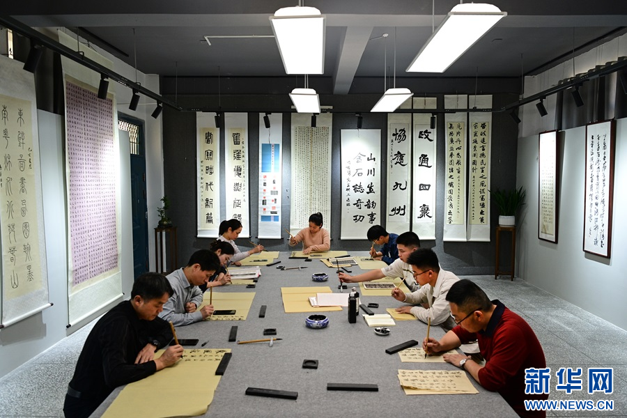 江西省宜春市万载县茭湖乡中心小学老师在参加汉字书写大赛软笔项目的比赛。新华网发 邓龙华 摄