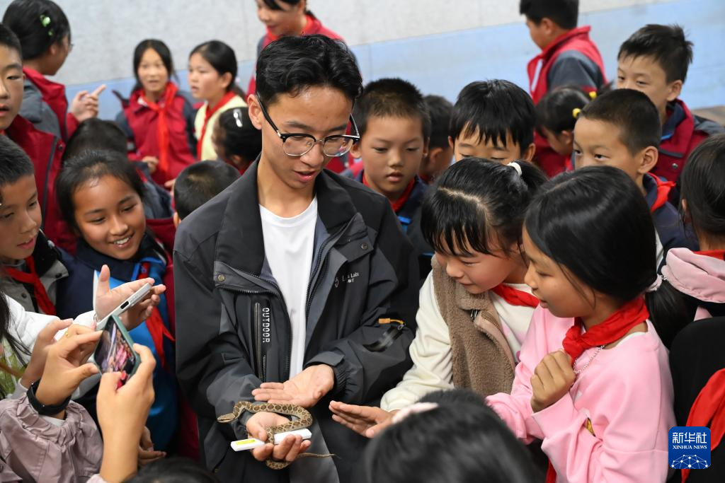 11月14日,科研人员周鑫龙在婺源县龙山学校公益自然科普课程中介绍蛇类知识。新华社记者 隋尚君 摄