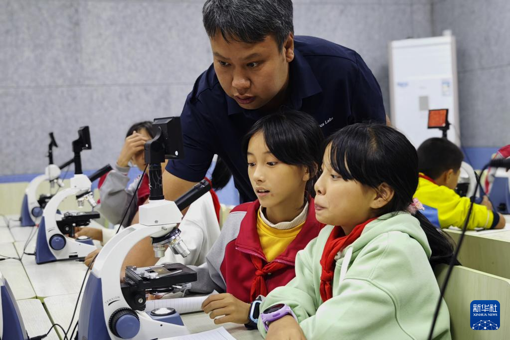 10月30日,科研人员刘芝龙(右三)在婺源县珍珠山乡中心小学开展公益自然科普课程。
