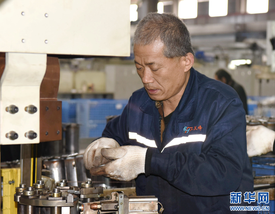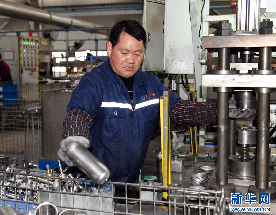 九江汉峰科技有限公司生产车间内,工人在加工生产线工作。新华网发