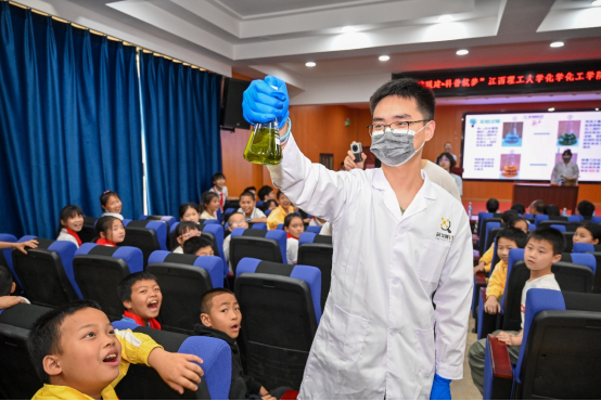 在江西理工大学廖金生教授的讲座中,孩子们通过化学科普了解到绚丽变幻莫测的灯光秀背后的神奇奥秘。在随后的科普实验环节,江西理工大学博士党员教师化身“科学魔法师”,用四大趣味实验点燃全场:李辉副教授的“红绿灯”揭示氧化还原反应的奥秘;徐慧博士的“彩虹雨”邂逅水油界面,演绎梦幻奇观;刘昆明副教授的“荧光棒的秘密”展示了化学光源的璀璨魅力……当刘遂军教授的“火山喷发”实验引发现场阵阵欢呼时,五年级学生卢蟠兴奋地说:“科学比动画片还神奇!我以后也要当科学家!”