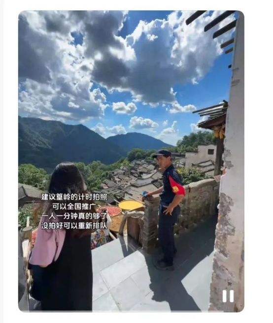 篁岭景区工作人员回应称,目前景区实行计时拍照的地点仅为晒工坊打卡点。若有游客排队等候拍照,工作人员会在打卡点附近计时,每人拍照时间约为一分钟。