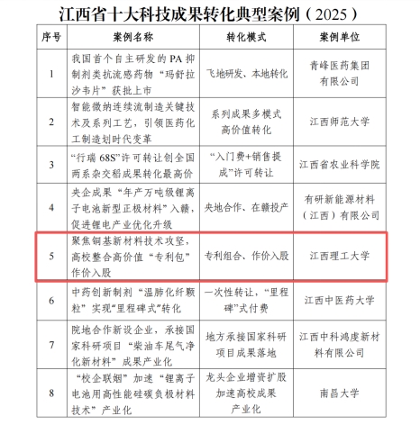 江西理工大学紧密聚焦江西省加快推进制造业高质量发展、积极打造国家级先进制造业集群的战略部署,成果转化项目“聚焦铜基新材料技术攻坚,高校整合高价值‘专利包’作价入股”以专利组合为“金钥匙”、以作价入股为“新路径”,凭借对产业升级的显著推动作用及对成果转化模式的创新突破,成功入选 2025 江西省十大科技成果转化典型案例,为高校服务地方产业发展树立了示范标杆。