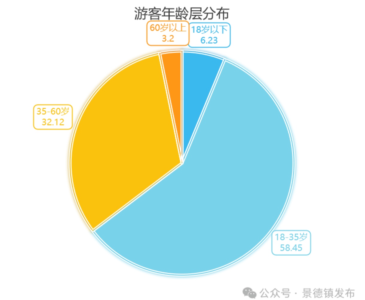 18岁以下未成年游客占比6.23%,多以家庭亲子游形式到访;18-35岁青年客群占比58.45%,是景区景点消费活力的核心来源,涵盖了追求潮流体验的年轻群体;35-60岁中年及中老年客群占比32.12%,兼具休闲度假与文化探索需求,消费能力稳定;60岁以上老年游客占比3.20%,更倾向于慢节奏的观光游览。