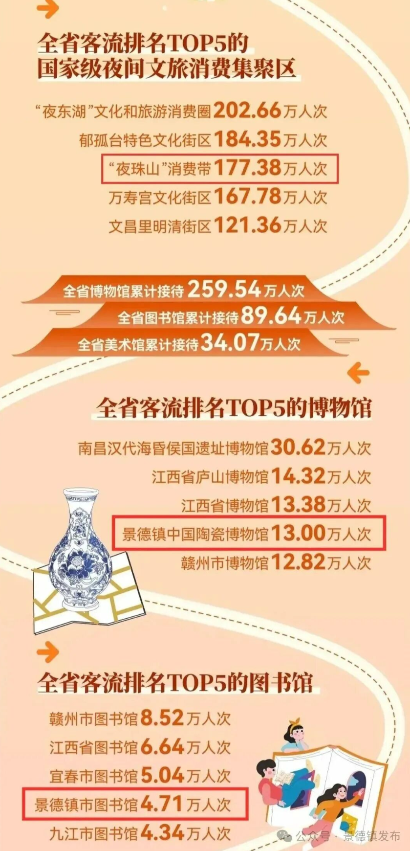 景德镇市三项文旅市场成绩排名全省前五。全市重点博物馆总参观人数37.40万,公共文化场馆服务14.5万人次。入境游5612人次,同比增长125.67%。